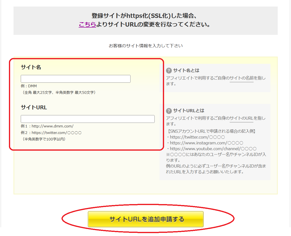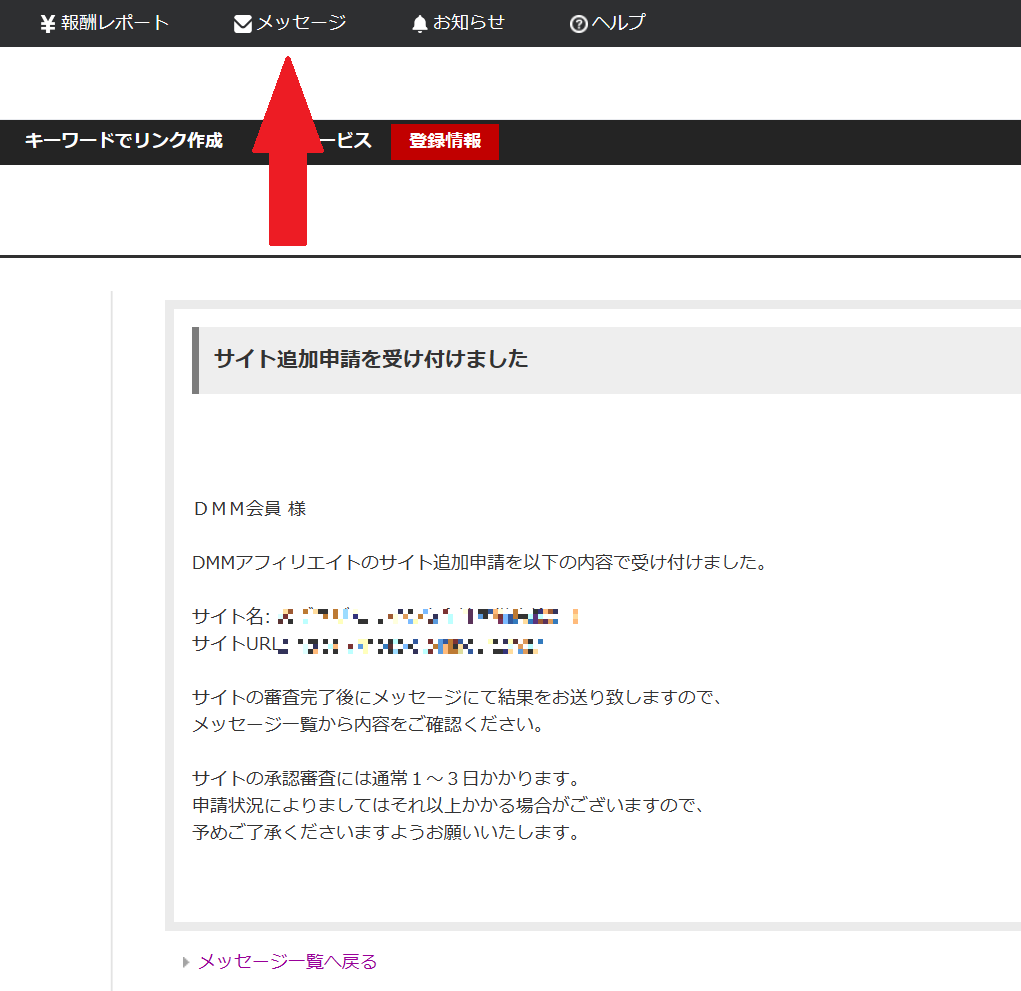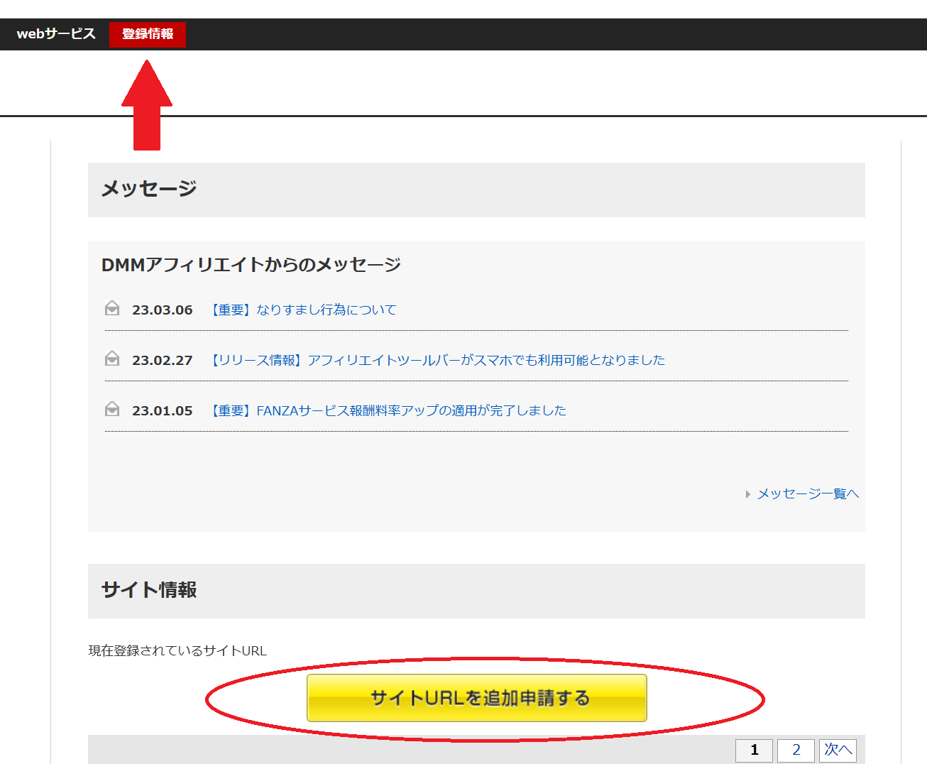 アフィリエイトトップページ画面上にある「登録情報」から「サイトURLを追加申請する」をクリック