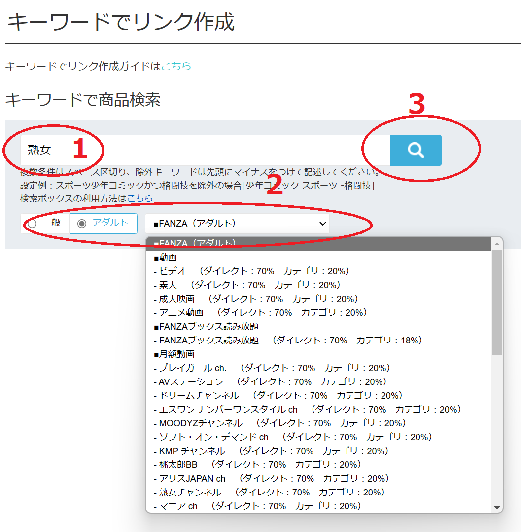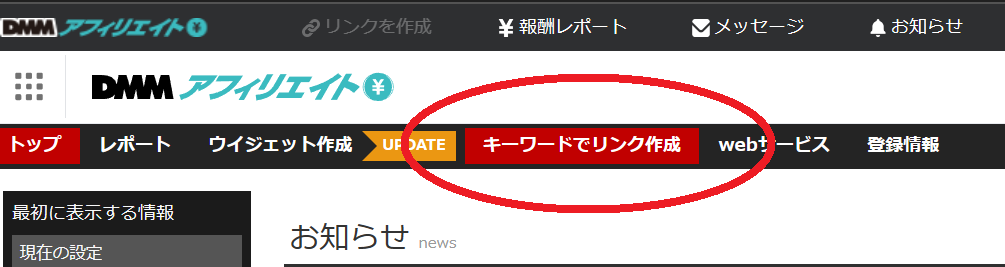 1.アフィリエイトページトップの「キーワードでリンクを作成をクリック」