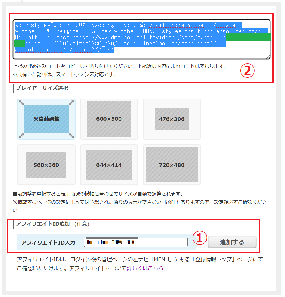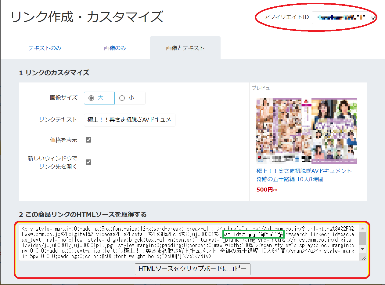 埋め込みコードに自分のアフィリエイトID(緑の個所)が反映された事を確認したら、コードをコピーして先程のアフィリエイトリンクの下に貼り付ければ完了です。