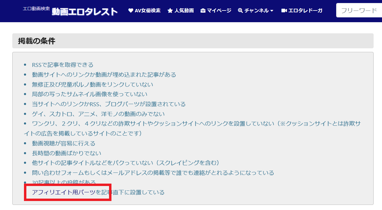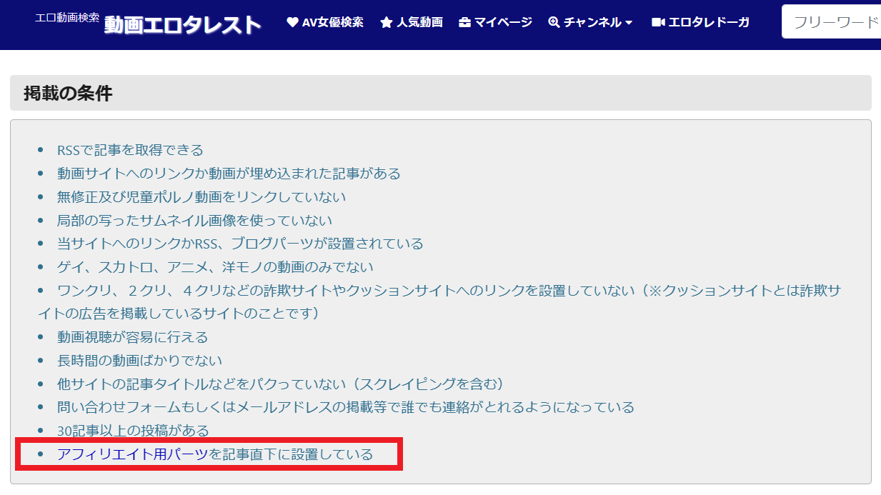 アフィリエイト用パーツを記事直下に設置していることが条件ですので