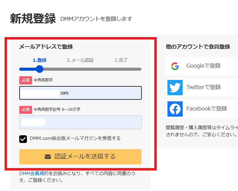 メールアドレスとパスワードを入力して認証メールを送信するをクリック。