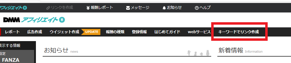 1.DMMアフィリエイトにログインし右上にある「キーワードでリンクを作成」をクリック