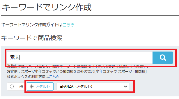 2.キーワードを入力し、FANZA(アダルト)を確認したら検索