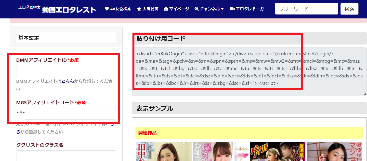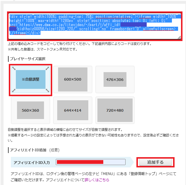 DMMとMGSのアフィリエイトIDを入力し貼り付け用コードをコピーします。