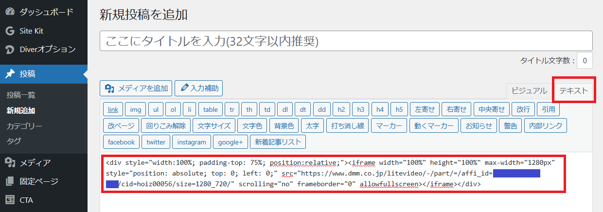 WordPressの投稿→新規追加から「テキスト」をクリックし本文にコードを貼り付ける
