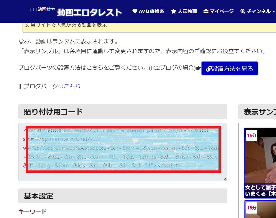 ページ上部にある「貼り付け用コード」をコピーし自分のエログに貼ります。